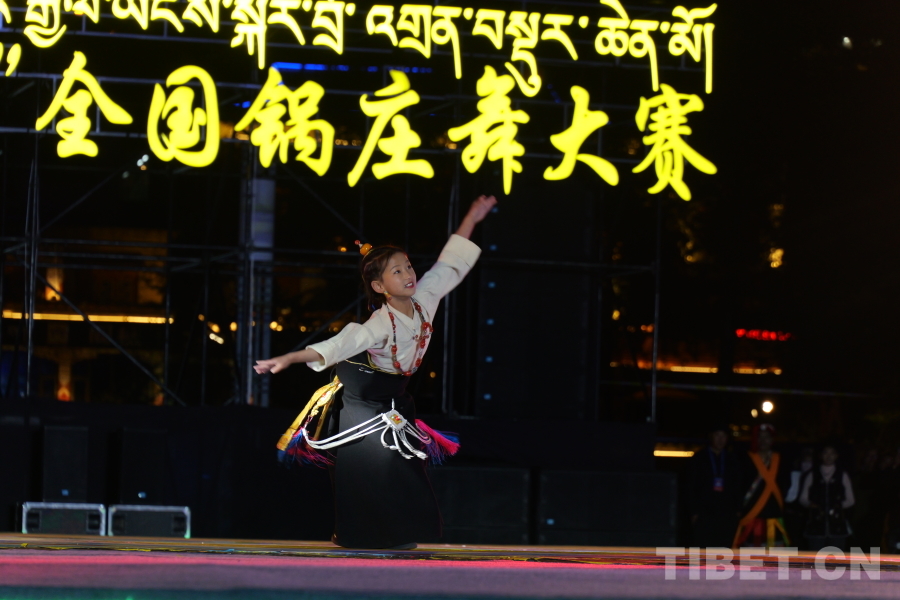 图为2025年“舞动玉树”全国锅庄舞大赛现场,一位小舞者为现场观众献舞,年轻一代的加入,成为比赛现场锅庄舞艺术薪火相传的动人风景